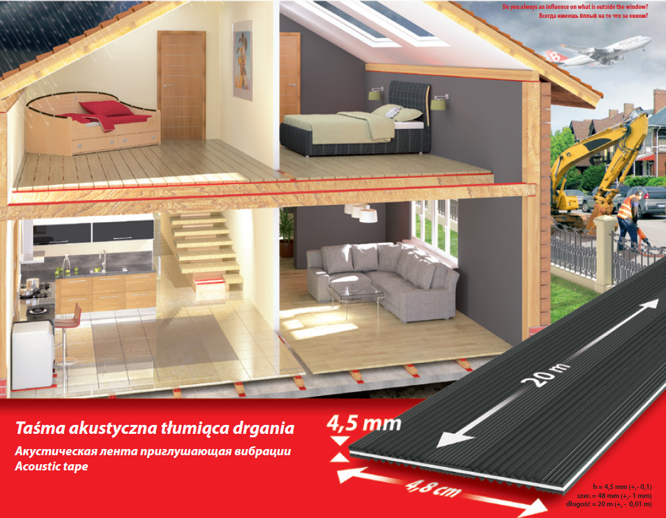 Taśma akustyczna wpływa na tłumienie drgań akustycznych. Specjalnie ukształtowane porowate powierzchnie zewnętrzne chronią dodatkowo przed utratą ciepła, zabezpieczają przed wilgocią oraz wyrównują nierówności podłoża. W taśmie izolacyjnej zastosowano trwałe połączenie dwóch tworzyw termoplastycznych o odmiennych właściwościach fizyko – mechanicznych a w szczególności o różnej gęstości i twardości, gdzie na styku tworzyw następuje rozproszenie i wytłumienie drgań.